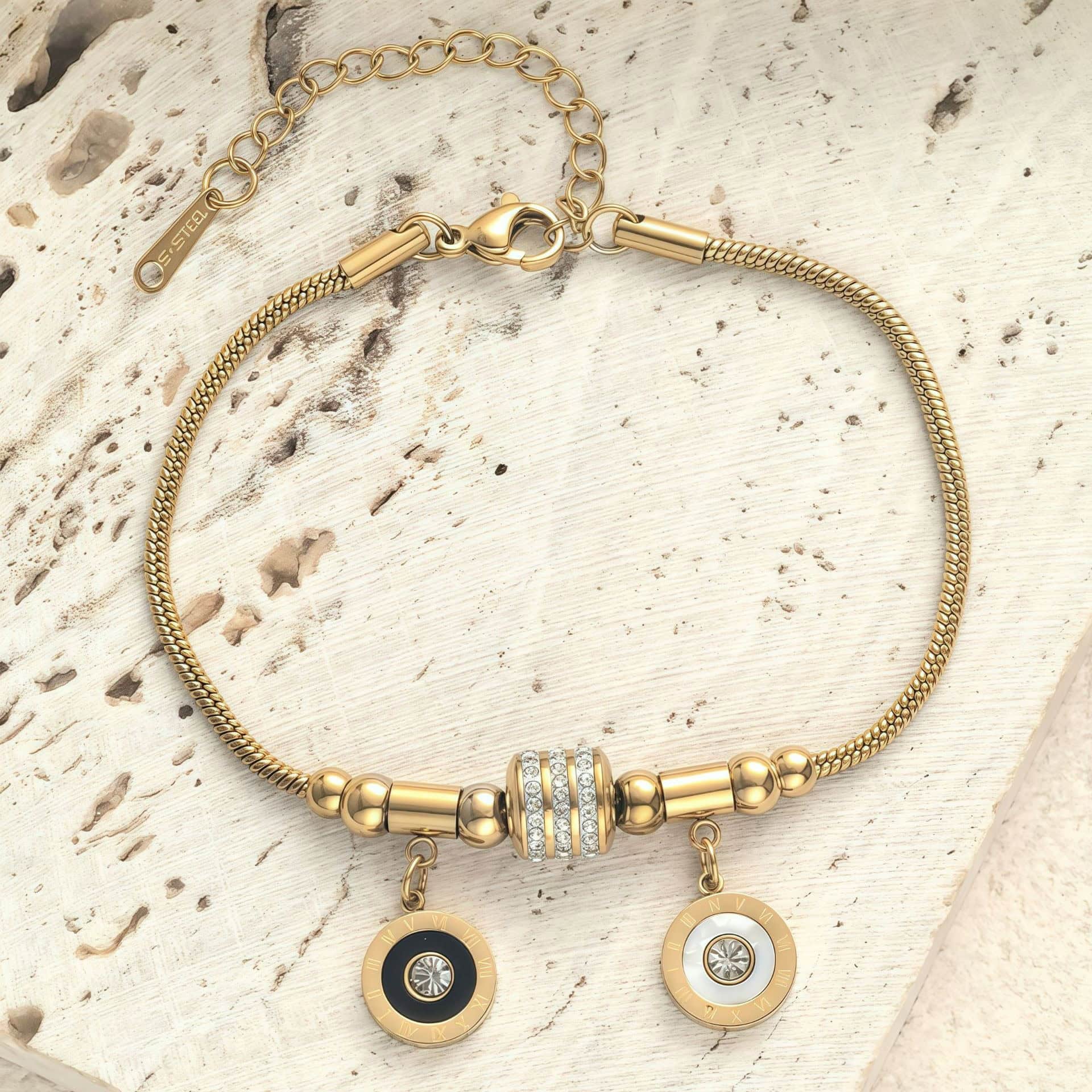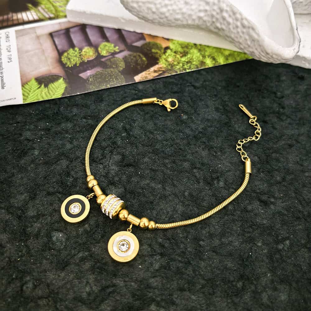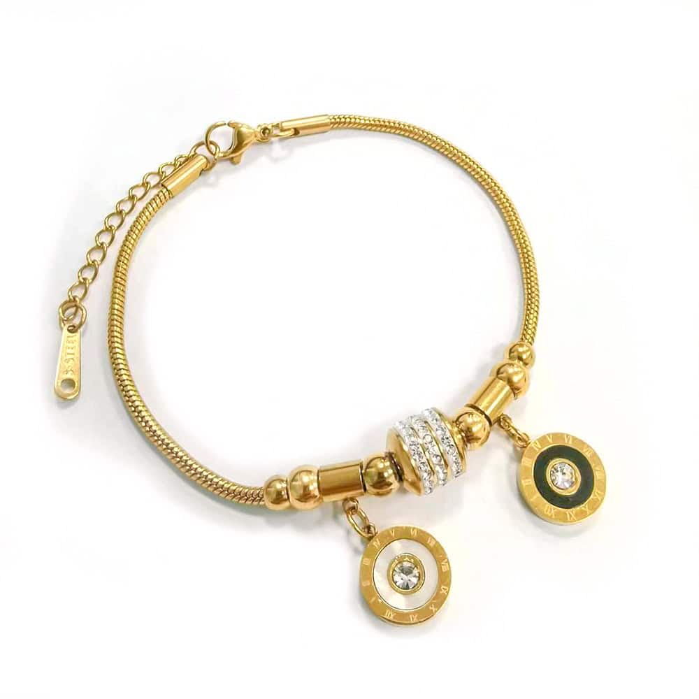 Introducere » BIJUTERII FEMEI INOX » Brățară De Damă Din Inox Auriu Cu Charmuri Rotunde Bicolore Și Cristale, Model Reglabil, Placată Cu Aur 18K, Accesoriu Fashion Elegant 1963FH